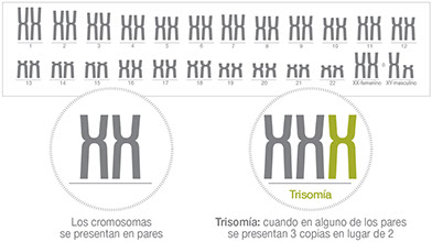 Faltantes o copias adicionales de cromosomas se conocen como "aneuploidías" y están asociadas con condiciones particulares en el embarazo.